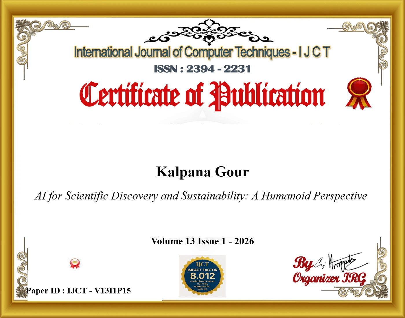 Kalpana Gour (2025). AI for Scientific Discovery and Sustainability: A Humanoid Perspective. International Journal of Computer Techniques, 12(6). ISSN: 2394-2231.