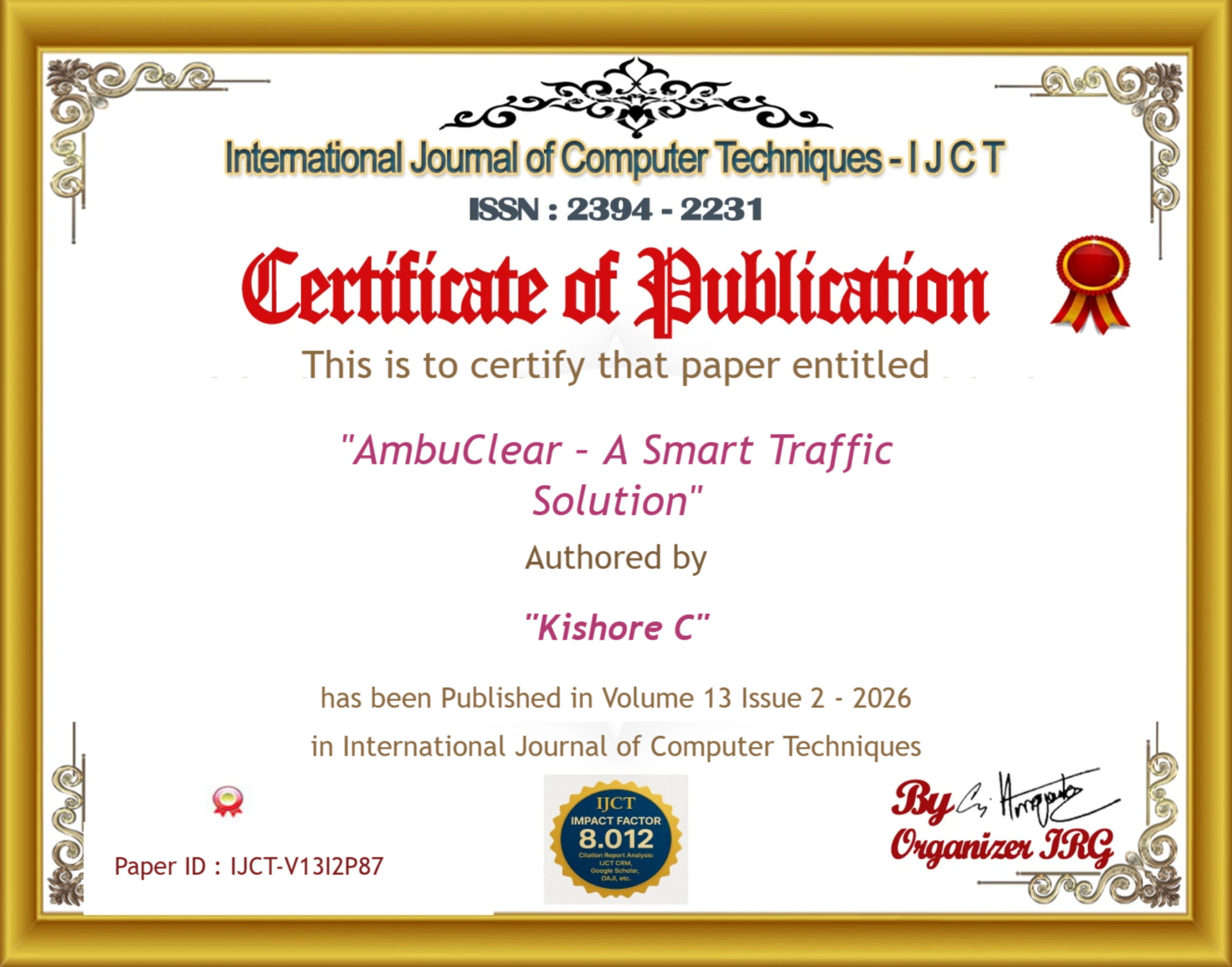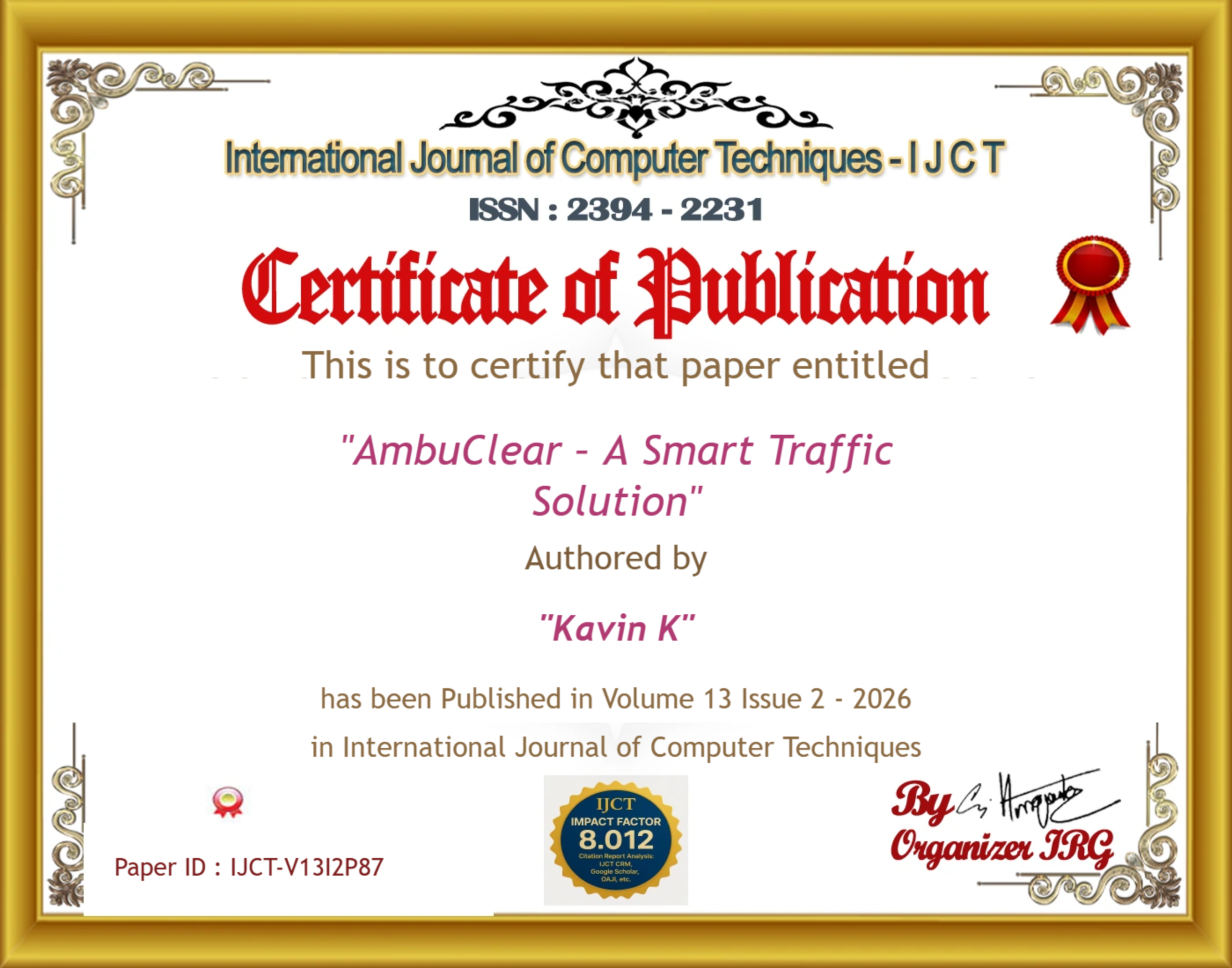 Dr. K. Sundara Velrani, Logeshwaran J, Jaishree K, Kavin K, P Harish, Kishore C (2026). AmbuClear – A Smart Traffic Solution. International Journal of Computer Techniques, 13(2). ISSN: 2394-2231.