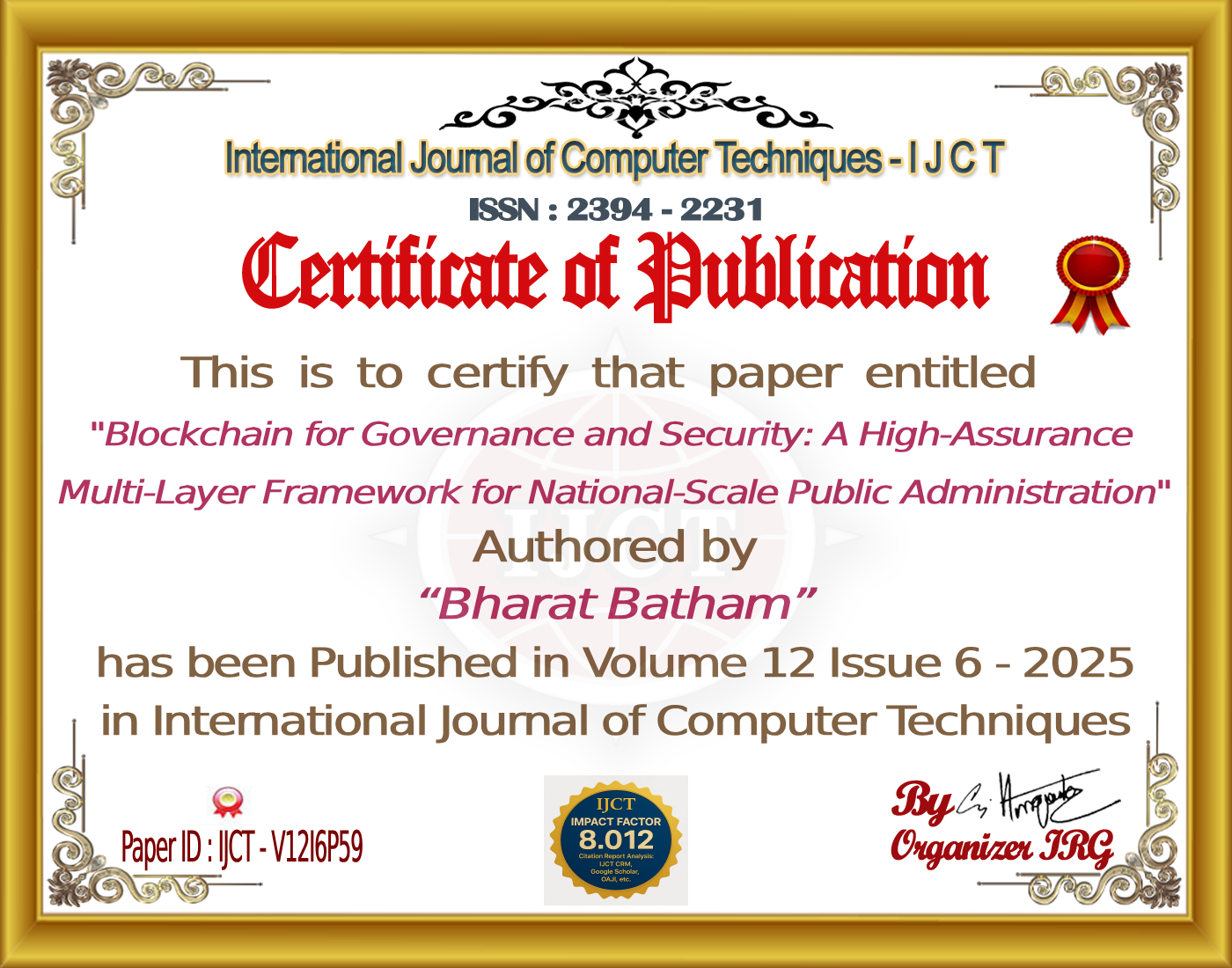 Bharat Batham (2025). Blockchain for Governance and Security: A High-Assurance Multi-Layer Framework for National-Scale Public Administration. International Journal of Computer Techniques, 12(6). ISSN: 2394-2231.