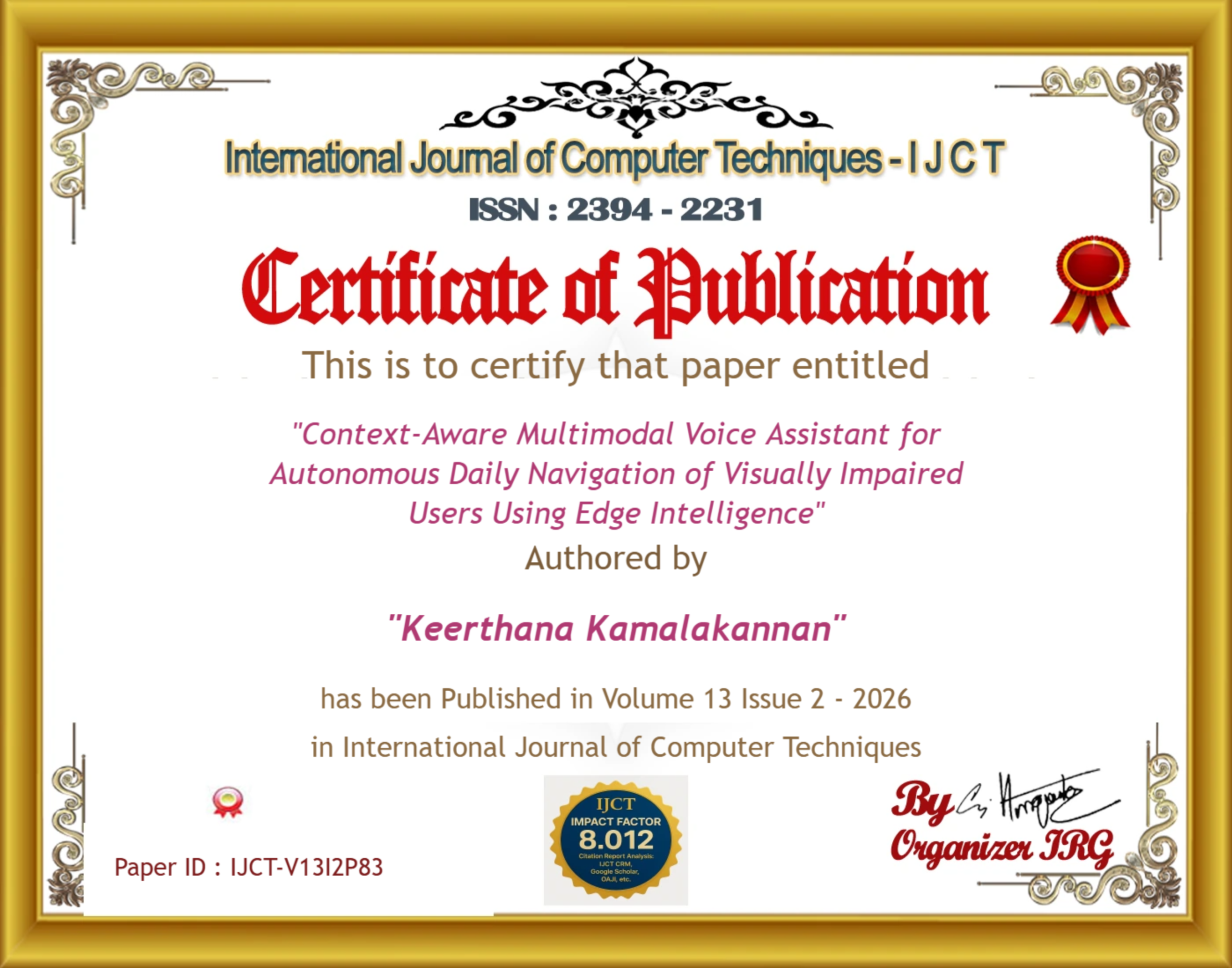 Dr. K. Sundara Velrani, Keerthana Kamalakannan, Jeysri K, Janani A, Hariram S (2026). Context-Aware Multimodal Voice Assistant for Autonomous Daily Navigation of Visually Impaired Users Using Edge Intelligence. International Journal of Computer Techniques, 13(2). ISSN: 2394-2231.