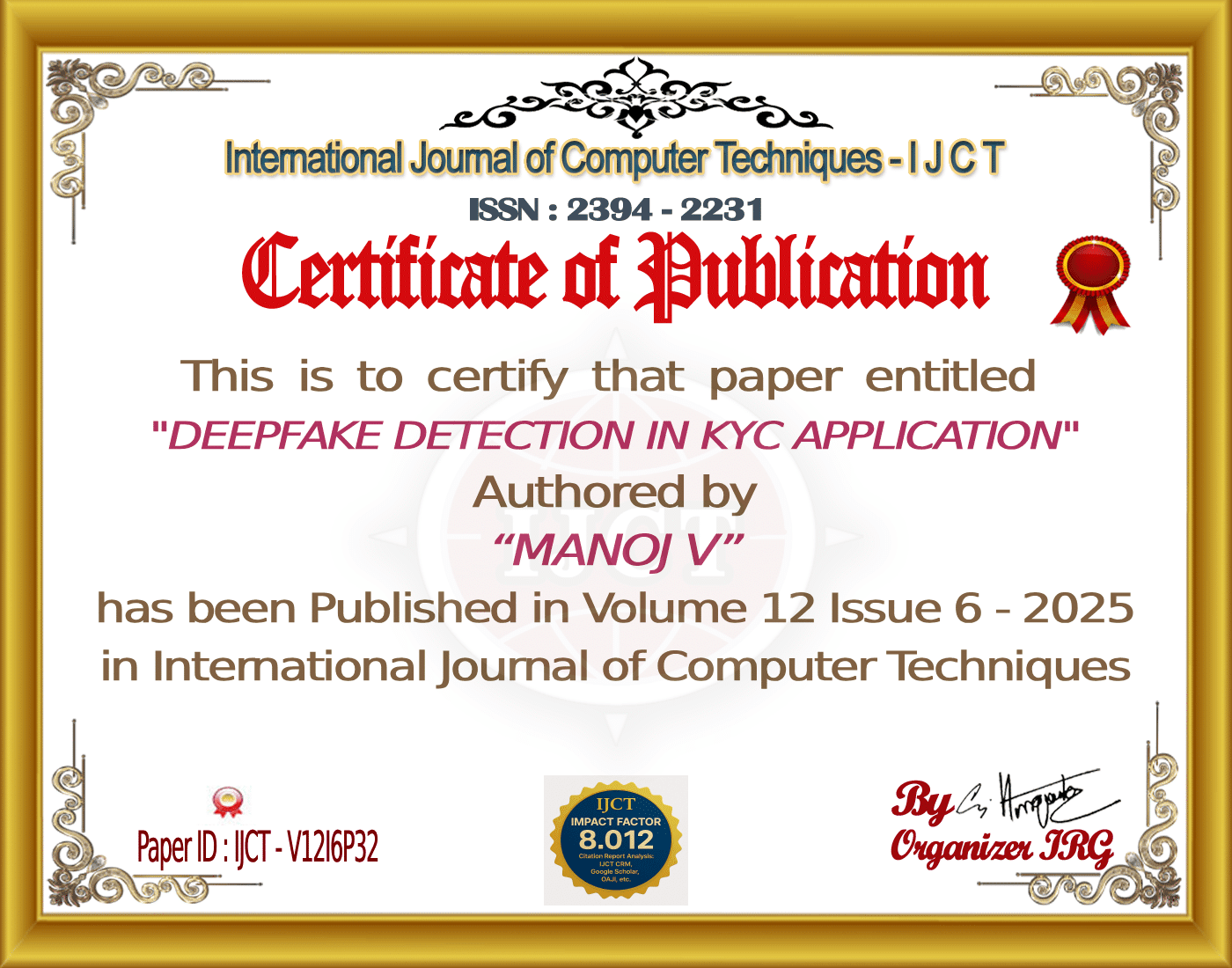 TIRUPATI C RATHOD, KARTHIK H E (2025). DEEPFAKE DETECTION IN KYC APPLICATION. International Journal of Computer Techniques, 12(6). ISSN: 2394-2231.