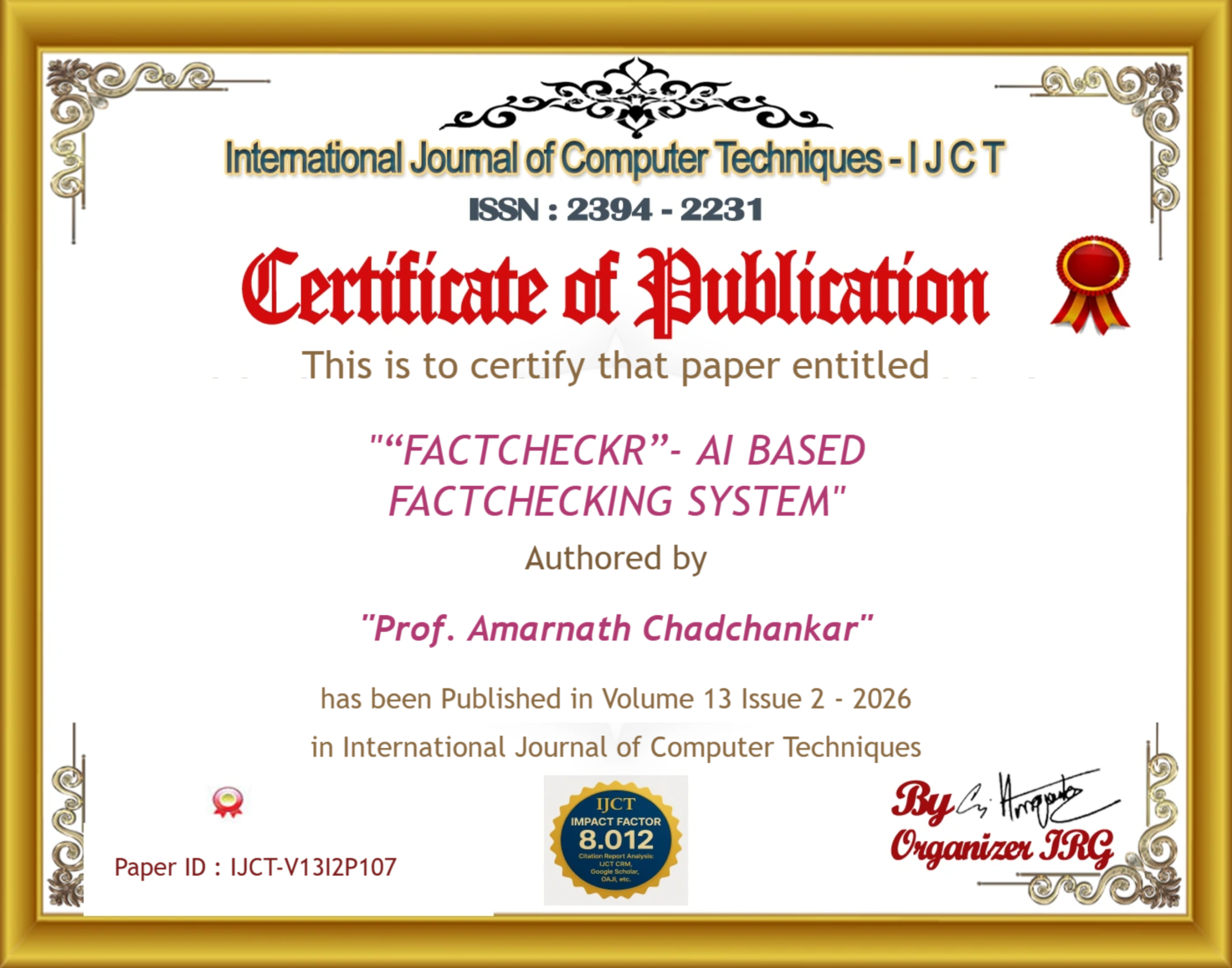 Aditi S. Vishwase, Om Rachkar, Prathamesh Salunkhe, Prof. Amarnath Chadchankar (2026). “FACTCHECKR”- AI BASED FACTCHECKING SYSTEM. International Journal of Computer Techniques, 13(2). ISSN: 2394-2231.