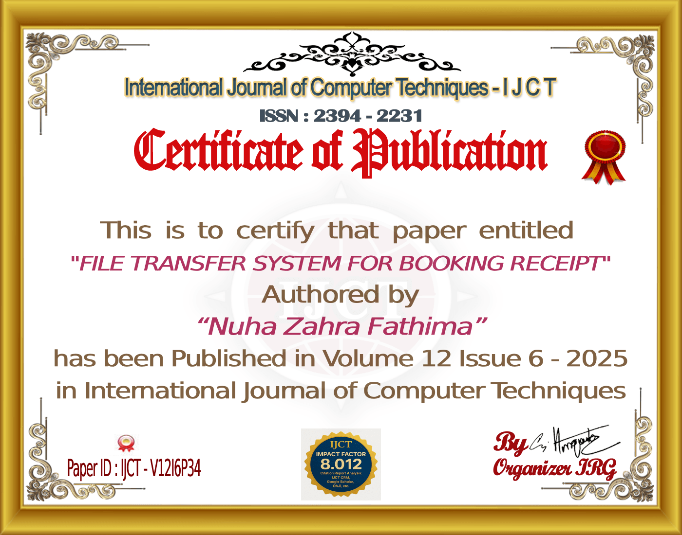 Ruby Angel T G, Janani k, Akshaya, Shankavi Ravichandran, Nuha Zahra Fathima, Deva Dharshini R (2025). FILE TRANSFER SYSTEM FOR BOOKING RECEIPT. International Journal of Computer Techniques, 12(6). ISSN: 2394-2231.