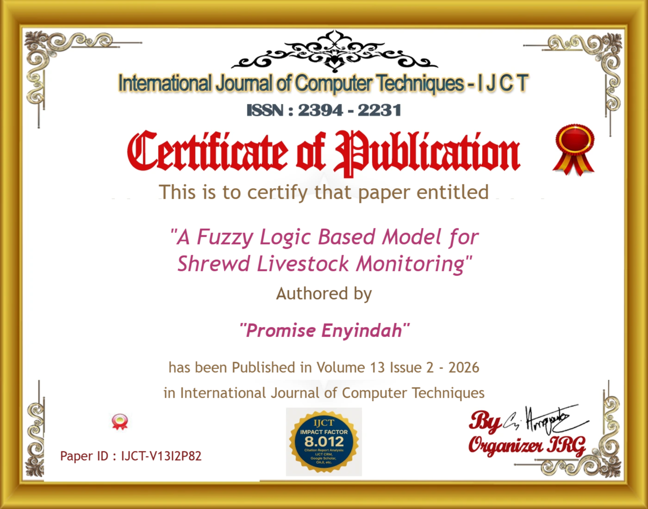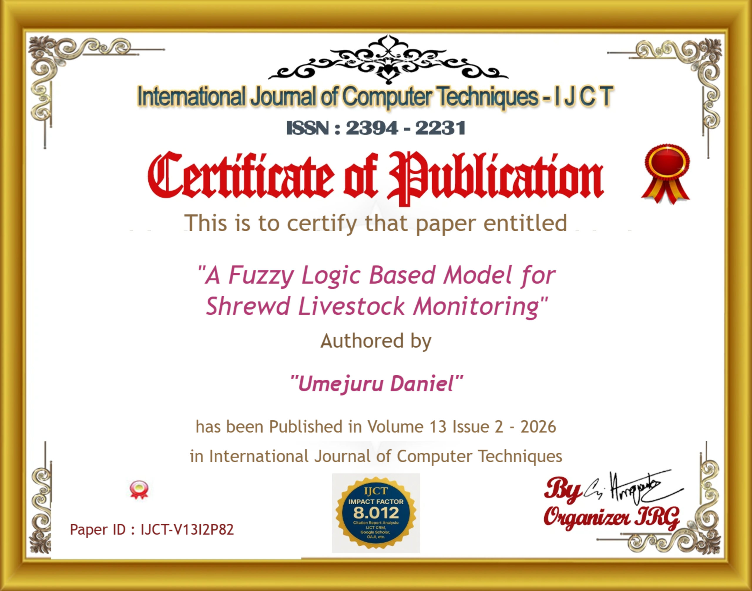 Promise Enyindah, Umejuru Daniel (2026). A Fuzzy Logic Based Model for Shrewd Livestock Monitoring. International Journal of Computer Techniques, 13(2). ISSN: 2394-2231.