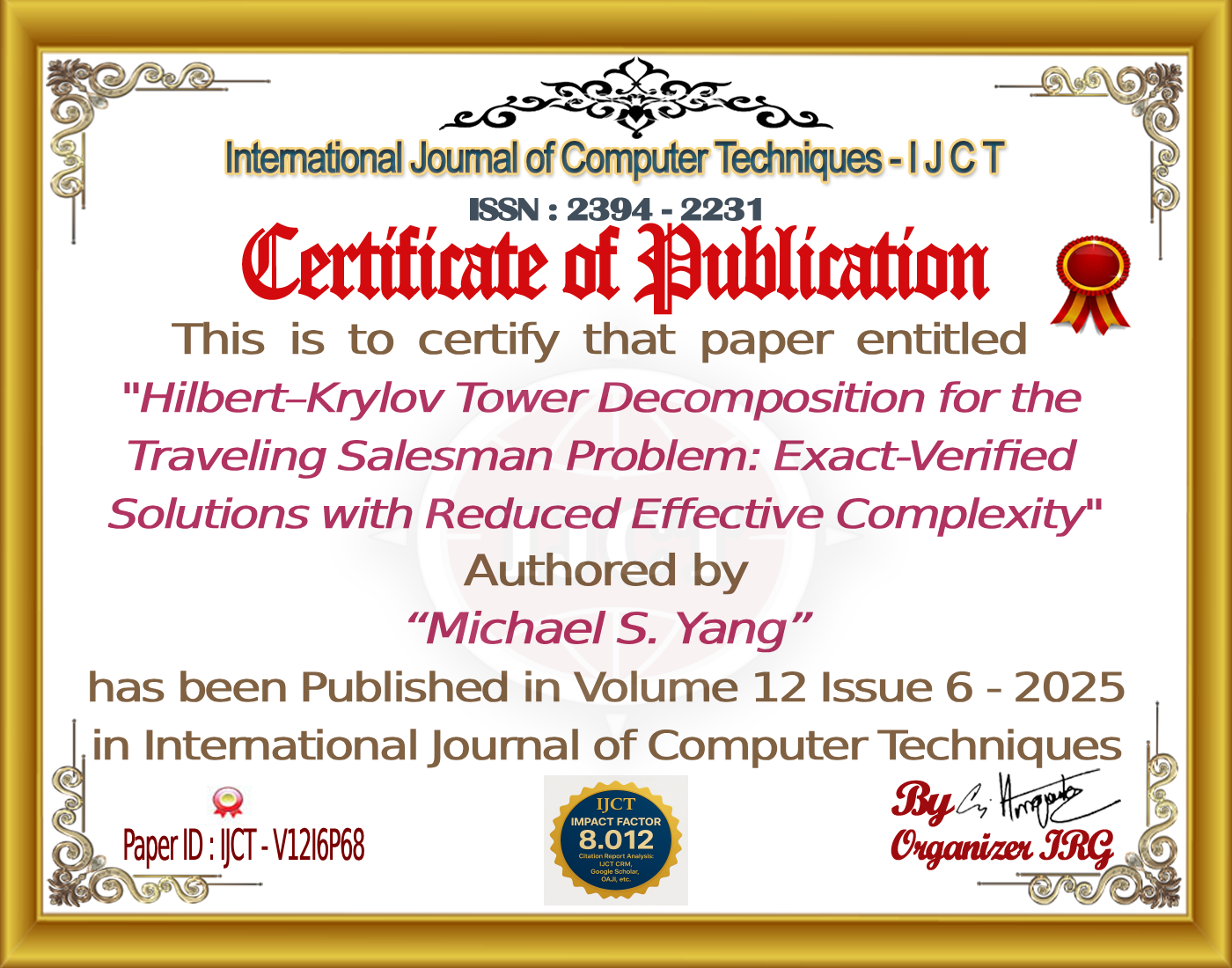 Michael S. Yang (2025). Hilbert–Krylov Tower Decomposition for the Traveling Salesman Problem: Exact-Verified Solutions with Reduced Effective Complexity. International Journal of Computer Techniques, 12(6). ISSN: 2394-2231.