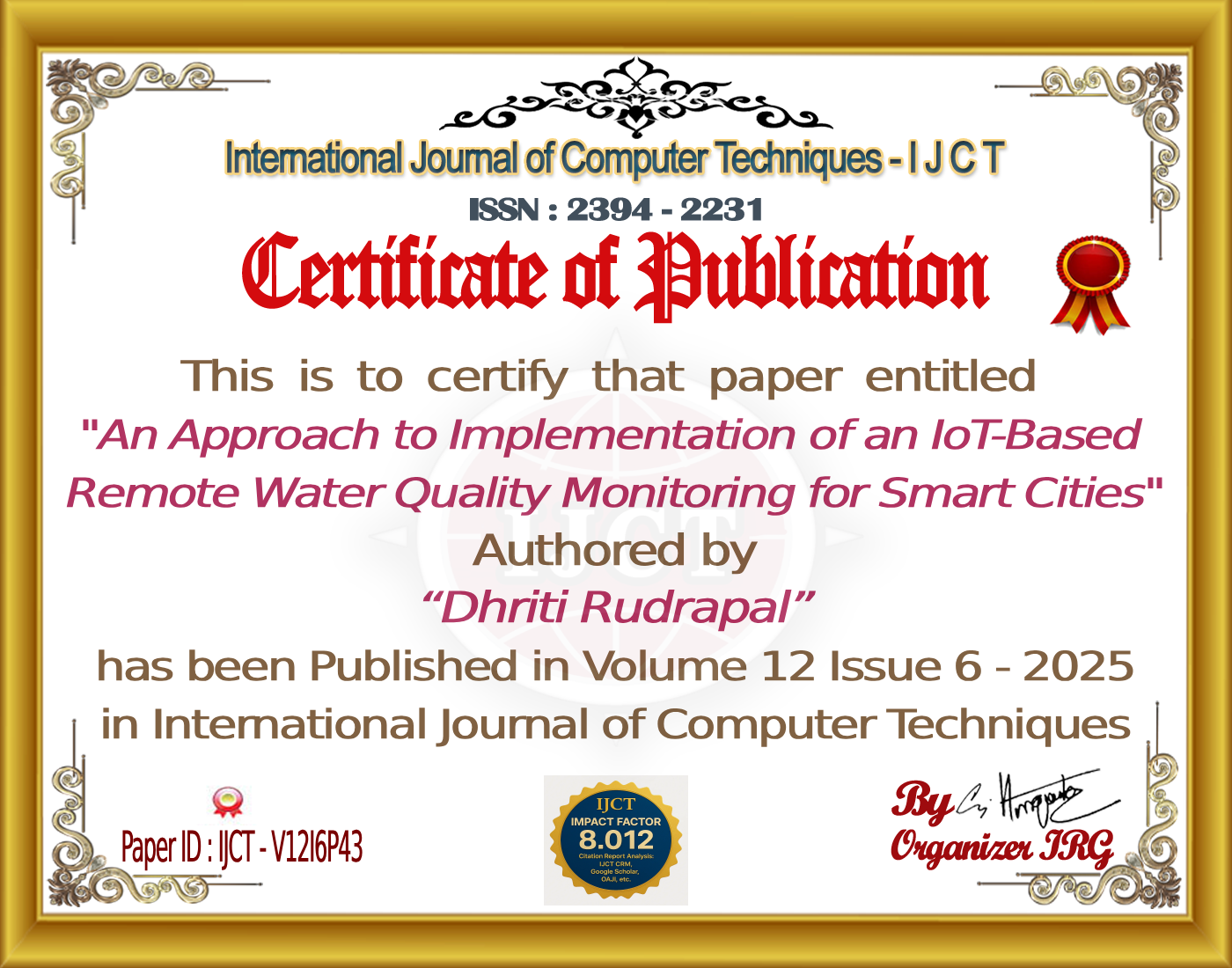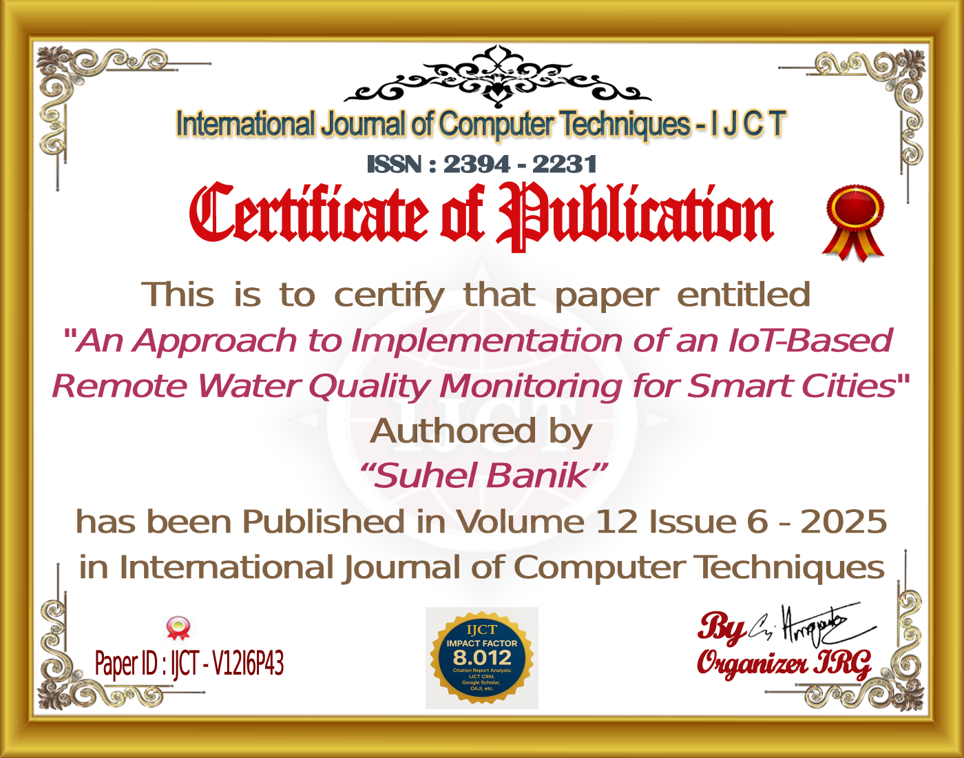 Suhel Banik, Swarnendu Ghosh, Tridip Saha, Dhriti Rudrapal, Tapan Kumar Mohanta (2025). An Approach to Implementation of an IoT-Based Remote Water Quality Monitoring for Smart Cities. International Journal of Computer Techniques, 12(6). ISSN: 2394-2231.