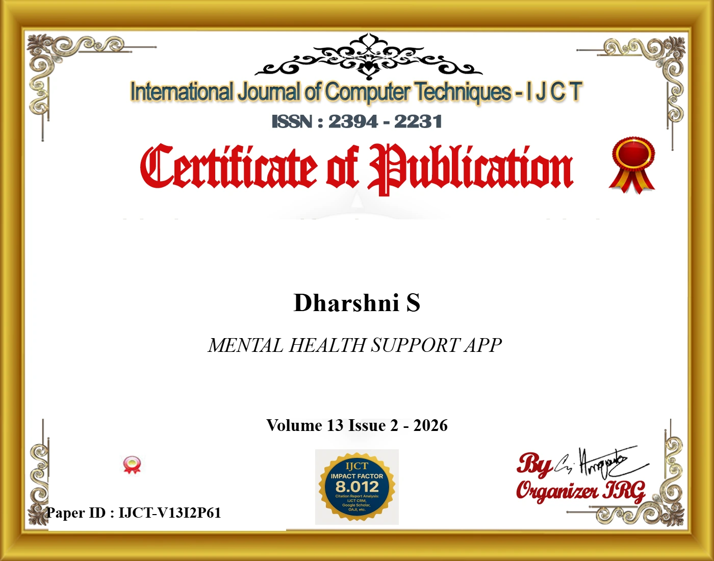 Ruby Angel T G, Janani k, Deva Dharshini R, Dharshni S (2026). MENTAL HEALTH SUPPORT APP. International Journal of Computer Techniques, 13(2). ISSN: 2394-2231.