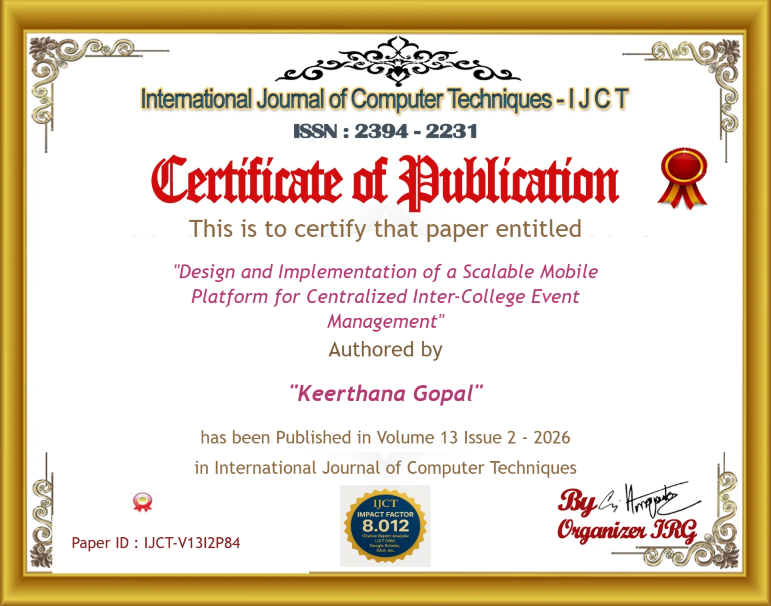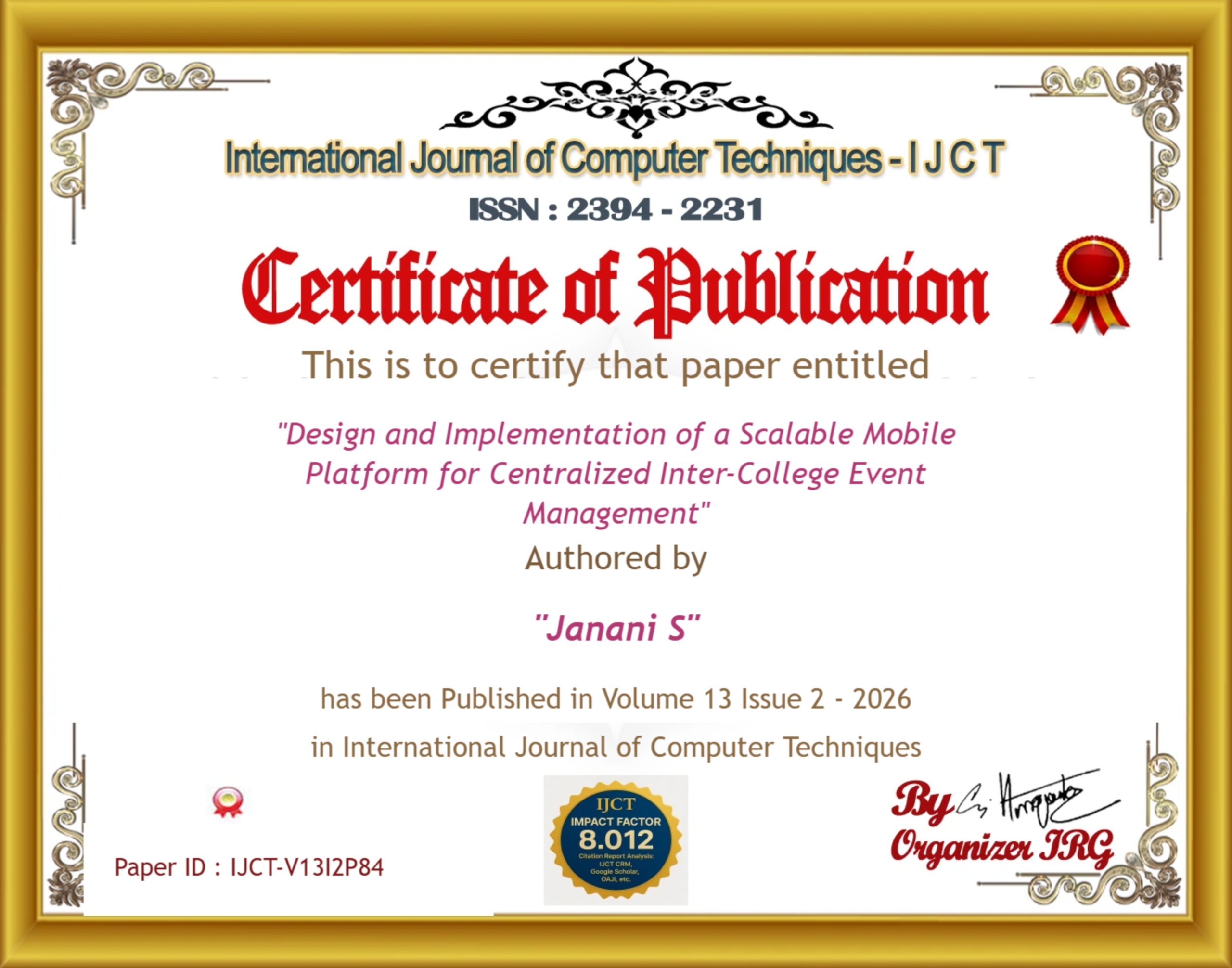 Dr. K. Sundara Velrani, Janani S, Keerthana Gopal, Kayalvizhi Nathan (2026). Design and Implementation of a Scalable Mobile Platform for Centralized Inter-College Event Management. International Journal of Computer Techniques, 13(2). ISSN: 2394-2231.