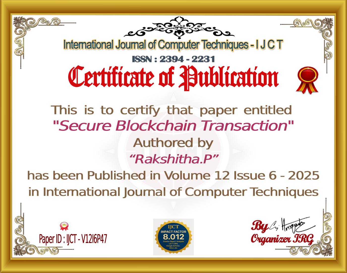 Ananya.N, Greeshma.M.S, Panchami.G, Vandhana.K.M, Rakshitha.P (2025). Secure Blockchain Transaction. International Journal of Computer Techniques, 12(6). ISSN: 2394-2231.