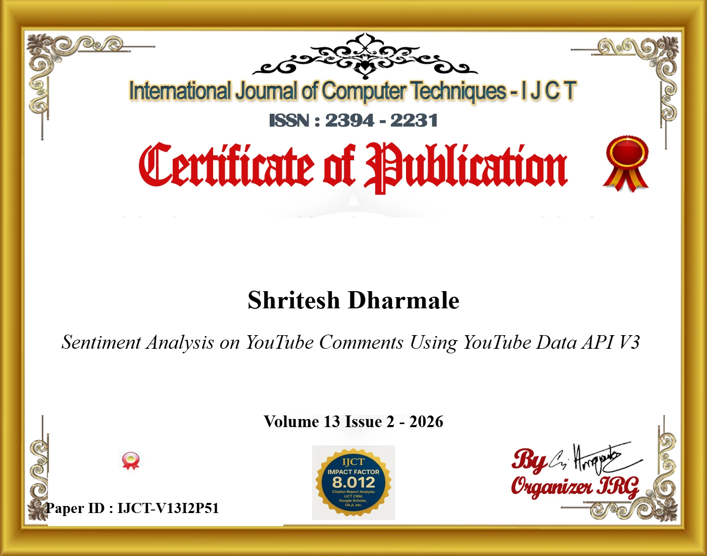 Bhuvansh Hiwrekar, Saksham Gorade, Shripad Bhakre, Tejas Wath, Shritesh Dharmale, Prof. Pravin Kaware (2026). Sentiment Analysis on YouTube Comments Using YouTube Data API V3. International Journal of Computer Techniques, 13(2). ISSN: 2394-2231.