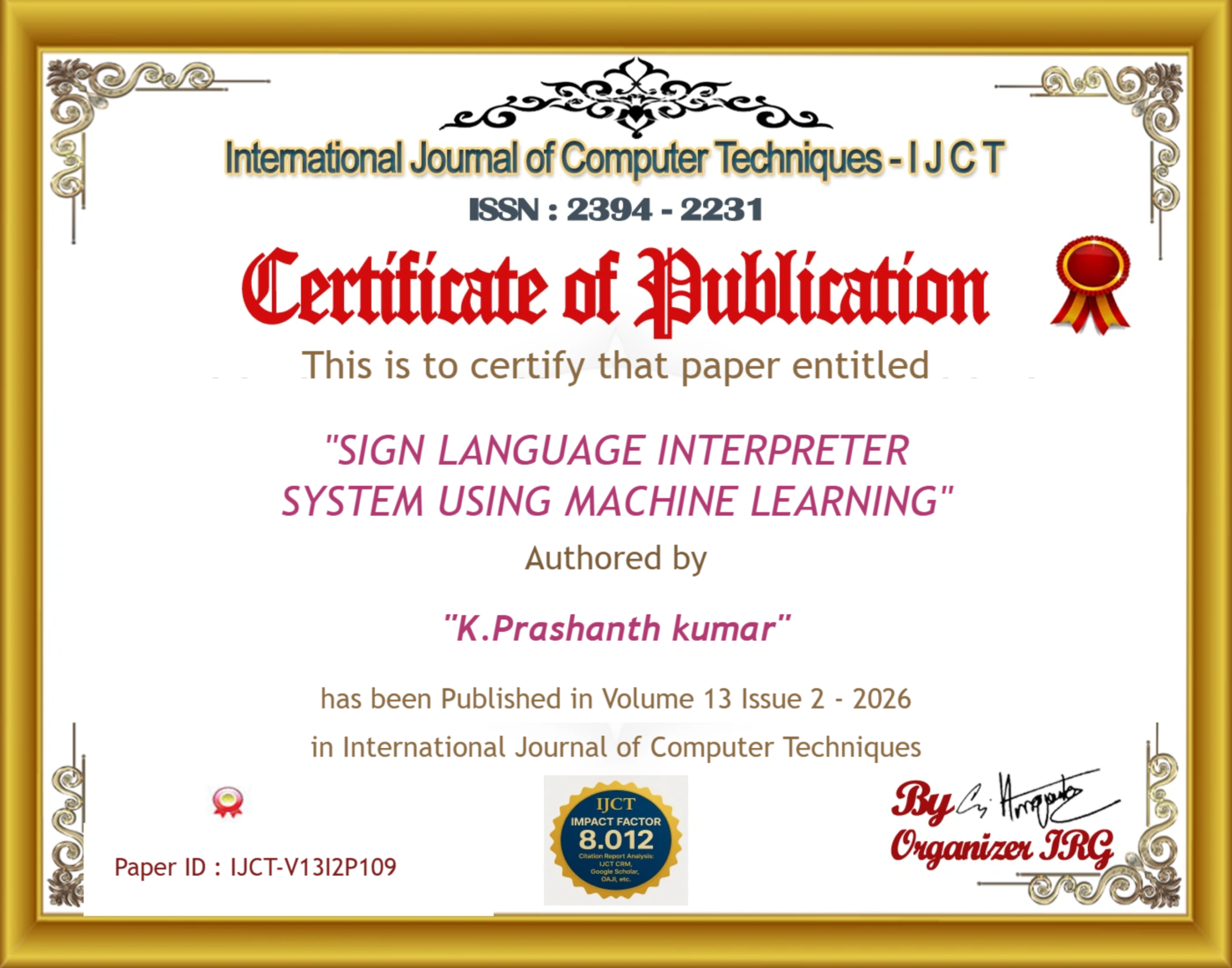 K.Prashanth kumar, G.Santhosh Reddy, K.Karthik Reddy, MR.A.T.Barani Vijaya Kumar (2026). SIGN LANGUAGE INTERPRETER SYSTEM USING MACHINE LEARNING. International Journal of Computer Techniques, 13(2). ISSN: 2394-2231.