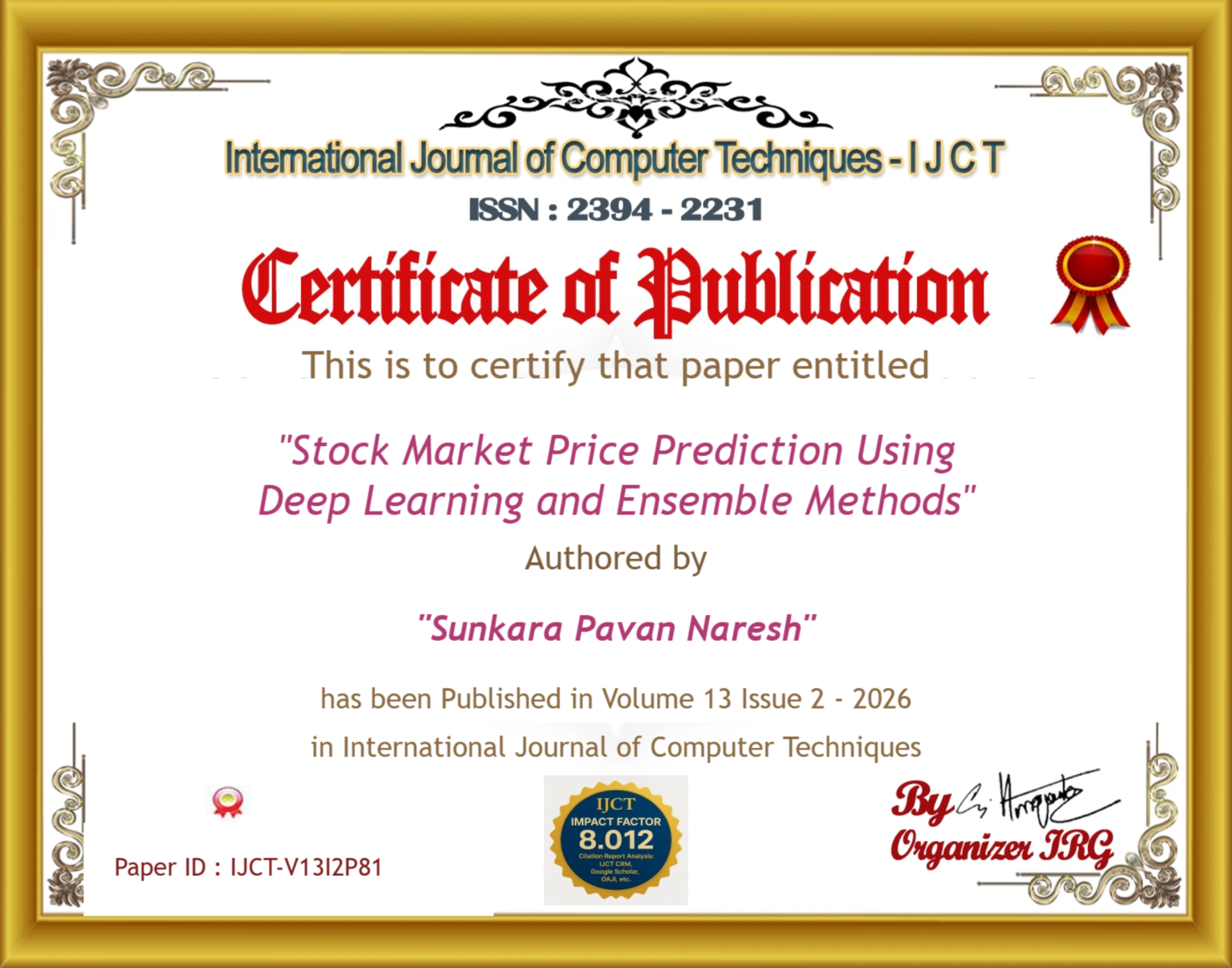 Varikallu Praveen kumar, Sunkara Pavan Naresh, Bandaru Teja Murthy, Mrs.v. Elavenil (2026). Stock Market Price Prediction Using Deep Learning and Ensemble Methods. International Journal of Computer Techniques, 13(2). ISSN: 2394-2231.