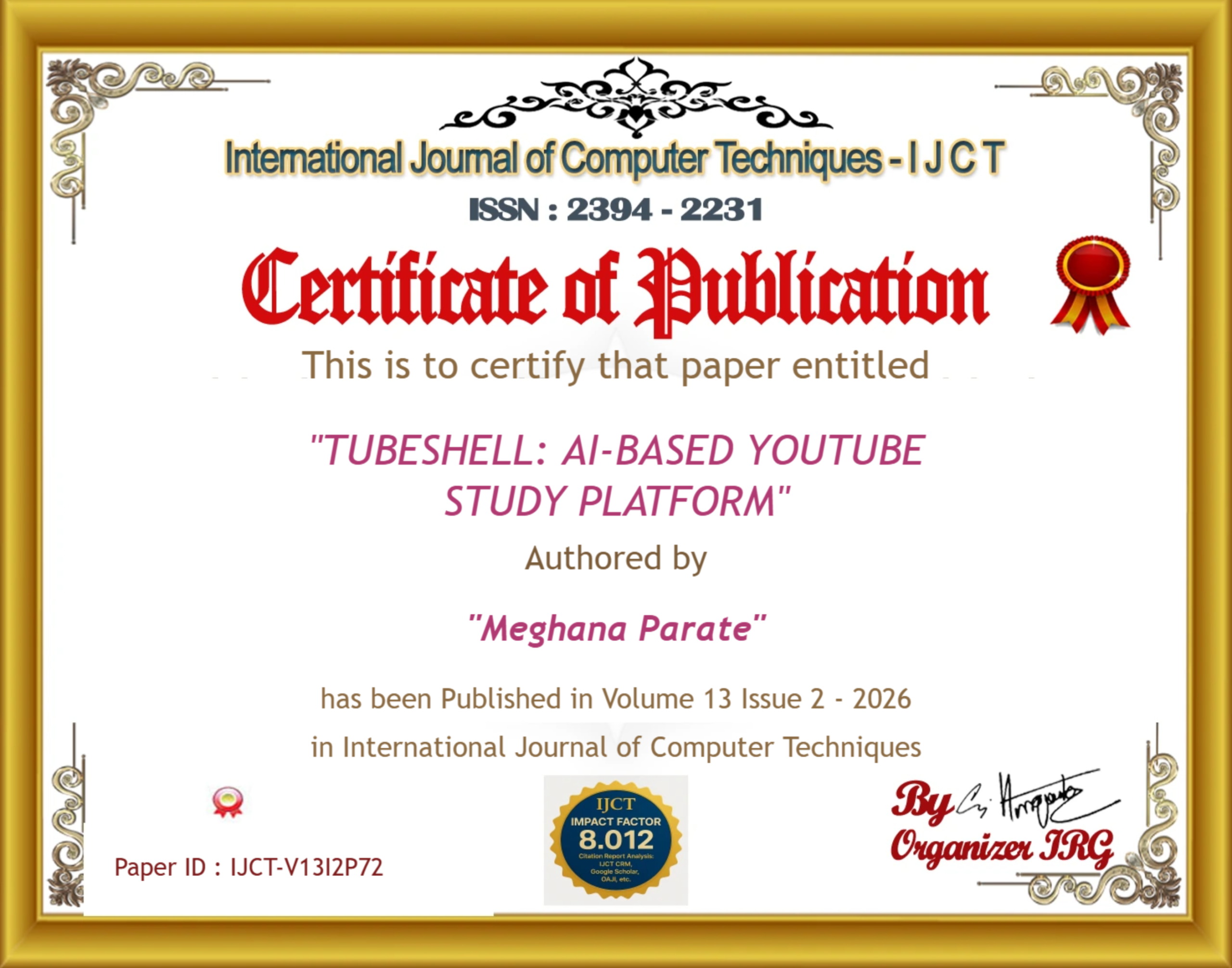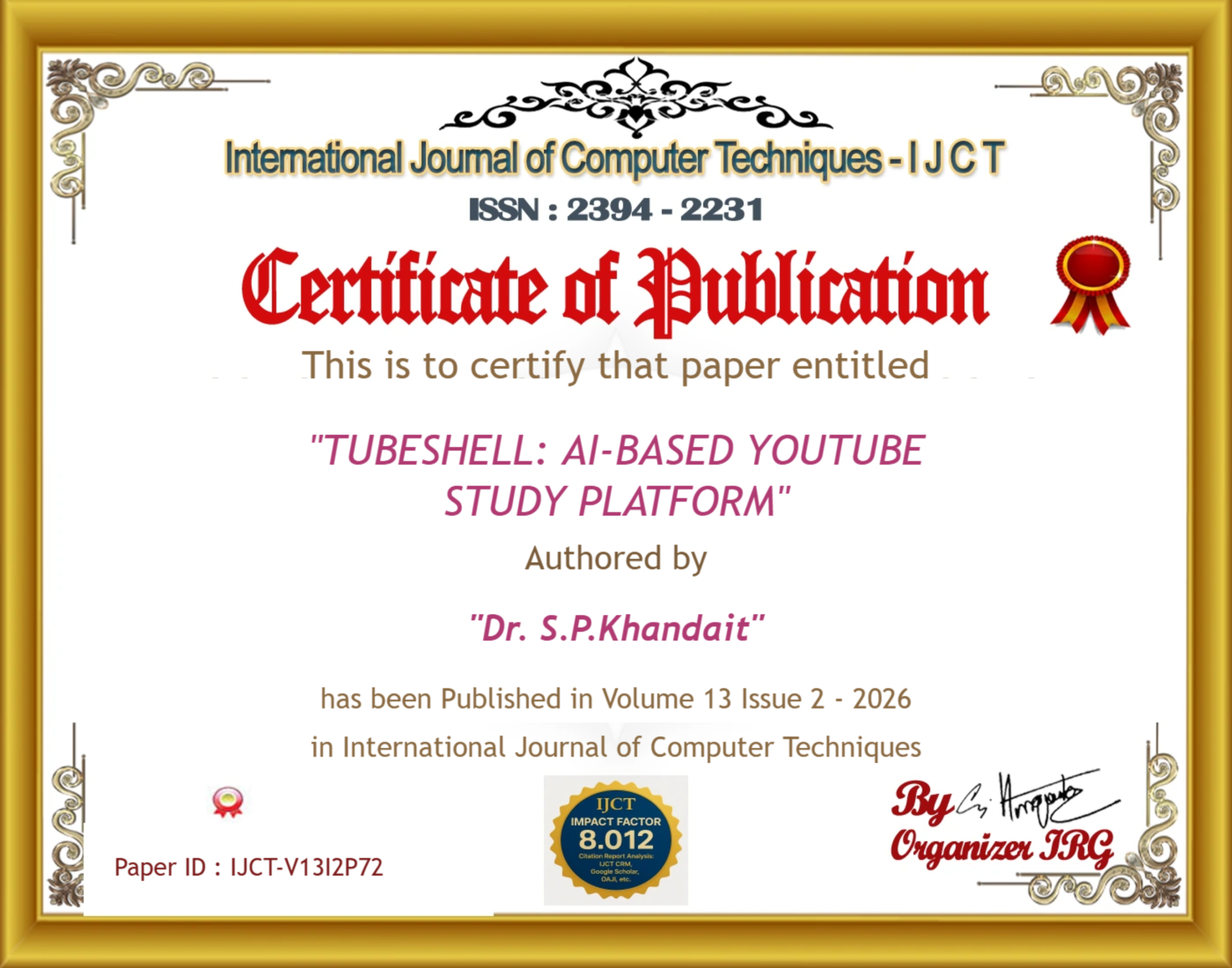 Dr. S.P.Khandait, Humera Sheikh, Meghana Parate, Nandini Peshne, Tanushri Dongre (2026). TUBESHELL: AI-BASED YOUTUBE STUDY PLATFORM. International Journal of Computer Techniques, 13(2). ISSN: 2394-2231.